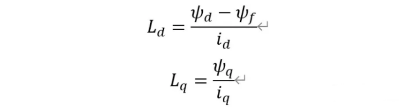 已知L=ψ/i,因此可以通过磁链分析电感。由于磁链方程中三相磁链之间相互耦合,不利于对电感的分析,所以将对三相电感的分析转化为对d、q轴电感的分析,即Ld、Lq。由于d、q之间完全解耦,d 轴磁路状态只与 d 轴电流相关, q 轴磁路状态只与 q 轴电流相关。可以得到,d、q轴上磁链和电感的关系: