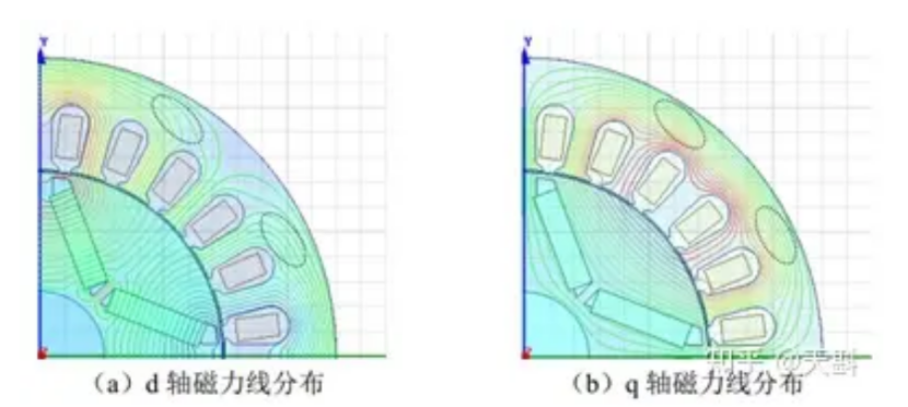 上图可以看到,当单独通d轴或q轴电流时,d、q存在共用耦合磁路的情况,因此,d(q)轴电流的变化,除了会改变自身轴的电感外,还会引起q(d)轴电感参数的变化。