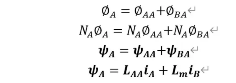 ψA,ψB为A,B线圈中的总磁链;ψAA,ψBB为A,B线圈自身通入电流产生的磁链;ψBA为由线圈B产生并与线圈A匝链的磁链。